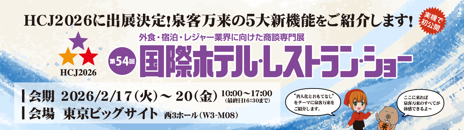 HCJ2026国際ホテル・レストラン・ショーに泉客万来で出展いたします。詳しくはこちらのページをご覧ください。