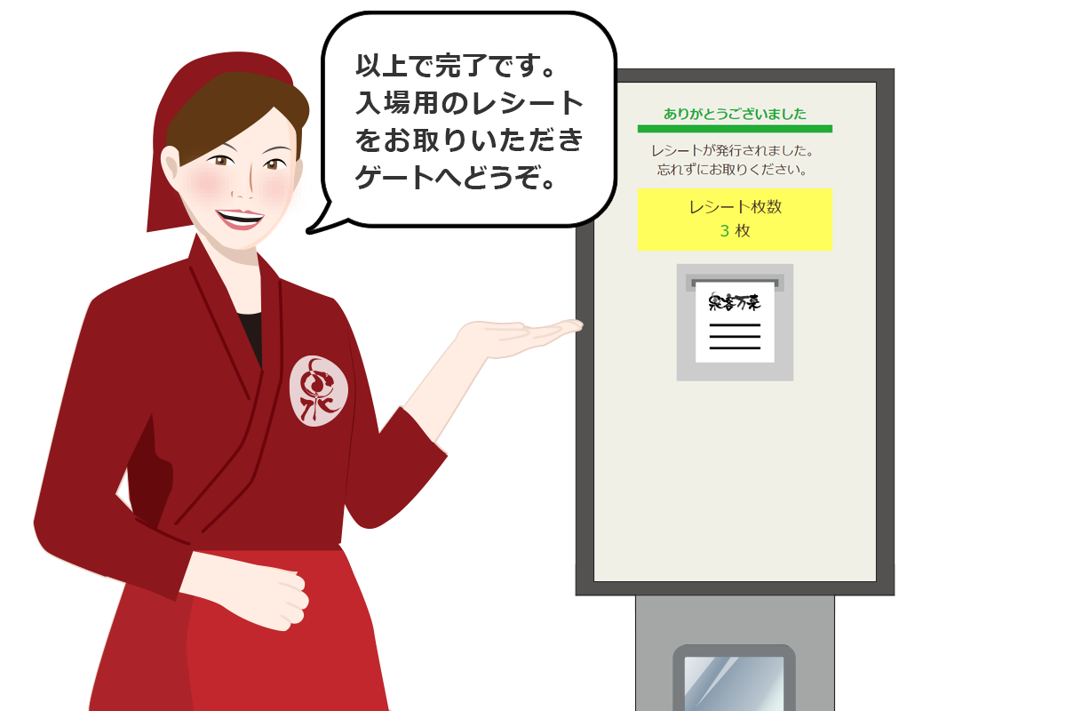 会員カード連携や電子回数券販売も受付機ひとつで完結し、コンパクトなボディは場所を取らずに複数台設置でき、受付窓口を増やすことで混雑緩和の効果も期待されています。また、館内の和の雰囲気と機械が調和していることもご評価いただいています。